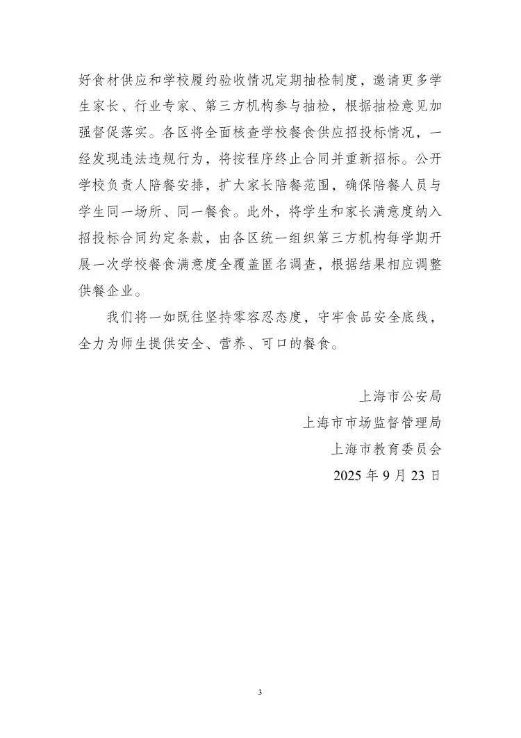 据报道,9月23日,针对市平易近反映的上海市部门学校午餐中虾仁炒蛋存正在问题一事,上海市、上海市市场监视办理局、上海市教育委员会再度发布环境传递。涉事企业绿捷公司涉嫌瞒报食物平安相关消息,目前机关已立案侦查,并节制相关人员。